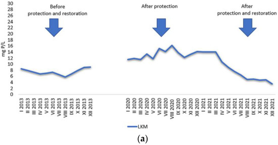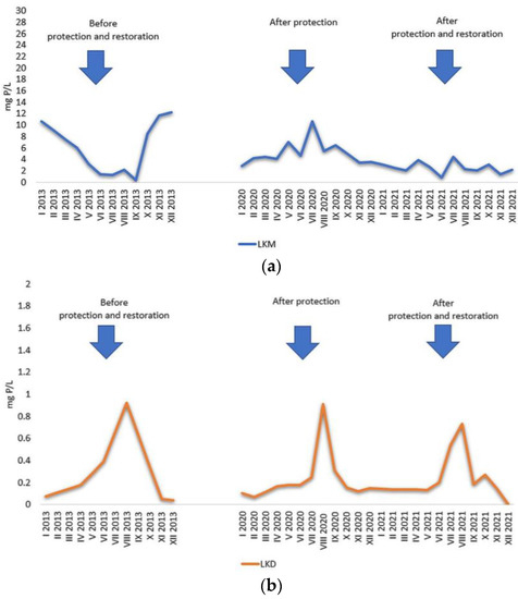 In 2013, before the protection and restoration of the lakes, the average concentration of TP was 0.522 mg P/L (±0.204) in LKM and 0.519 mg P/L (±0.450) in LKD (Figure 13). After restoration with the use of two types of compounds, a very clear decrease in the amount of TP was found in both lakes (Figure 13). In LKM, the average value was 0.279 mg P/L (±0.180) and in LKD, up to 0.306 mg P/L (±0.119). The reduction in TP content in surface water layers as a result of the protection and restoration measures was approximately 47% for LKM and 42% for LKD (Figure 13).