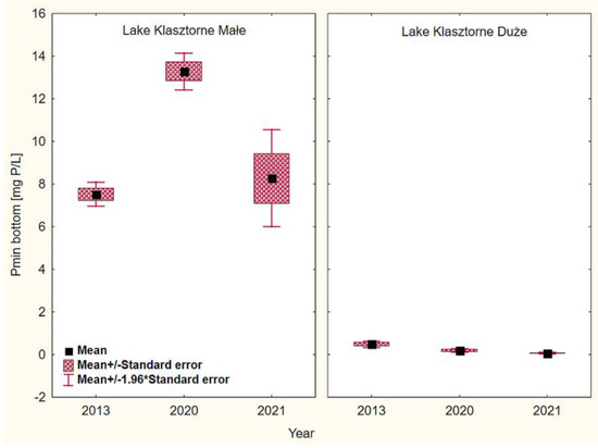 (a) Changes in the content of mineral phosphorus (Pmin.) in the bottom water layer of Lake Klasztorne Małe in selected research years. (b) Changes in the content of mineral phosphorus (Pmin.) in the bottom water layer of Lake Klasztorne Duże in selected research years.