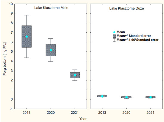 Average annual values of organic phosphorus (Porg.) in the bottom water of Klasztorne lakes in selected research years.