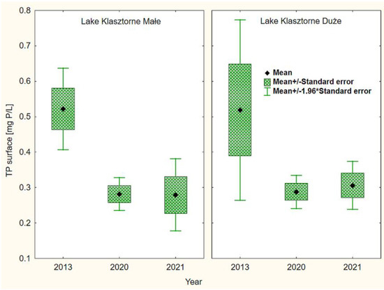 Statistical analysis showed highly statistically significant differences in the content of TP in the surface water layer of both Klasztorne lakes in the analyzed research years but did not show significant differences between the lakes.