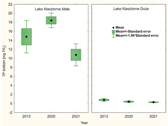 The statistical analysis showed highly statistically significant differences in the TP content in the bottom water layers of LKM among the analyzed research years. No such differences were found in the case of LKD. Statistical analysis also showed highly statistically significant differences in the TP content between lakes.