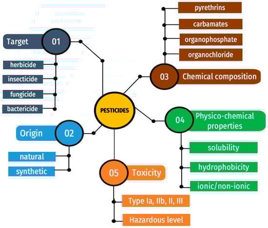 Pesticides can be categorized in many ways, namely origins, targeted species, chemical characteristics, active ingredients, mode of action and toxicity, just to name a few [40,41]. Figure 1 shows the general classifications of pesticides based on their target, origins, chemical composition, physico-chemical properties and toxicity. Pesticides can be man-made or occur naturally. Many synthetic pesticides have been produced using different chemicals that vary in their compositions, depending on intended application of the pesticides. Herbicides have wide usage in agricultural and wildland ecosystems to control the growth of undesirable weed populations, hence increasing the productivity of crops to achieve an economically profitable level [42]. Therefore, in parallel to the growth of agricultural activities, the usage of herbicide is the fastest growing section, which covers almost 50% of the pesticide industry [43]. Glyphosate and triazine compounds such as atrazine are herbicides that have been heavily used worldwide. These compounds can easily translocate in the ecosystem so their residues can be detected in soil, water, and biota. As the name implies, insecticides are chemicals used to kill insects to protect cultivated plants or to mitigate disease-carrying insects in some regions. Insecticides harm insects by disrupting their nervous system [44]. Neonicotinoids such as acetamiprid, thiacloprid and imidacloprid are a class of synthetic neuro-active insecticides widely used for insect control. Neonicotinoids impose selective toxicity through pharmacophores that can bind with the receptors of insect [45]. The toxicity effects of neonicotinoids on different species of invertebrates such as bees as well as on the metabolisms of aquatic organisms have been reported [46]. Other major categories of pesticide are rodenticides used to bait and control rodent population, as well as fungicide and bactericides which acts as an inhibitor of fungal spore germination and bacteria growth, respectively. Some pesticides can be used to control more than one class of pests. Based on the WHO classification, pesticides can be divided into several classes, varying from Type III for slightly hazardous pesticides such as malathion to Type Ia for extremely hazardous such as parathion.