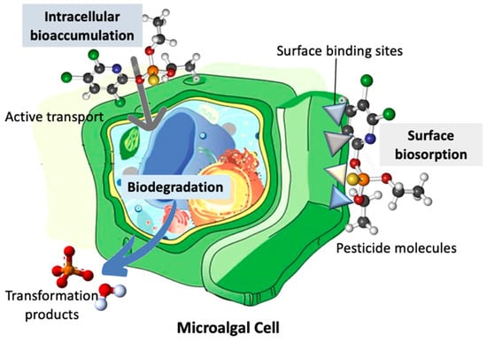 Schematic illustration of phytoremediation of pesticides by microalgae through biosorption, bioaccumulation and biodegradation.