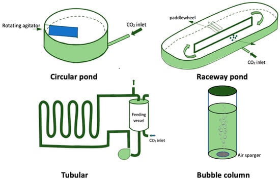 The treatments of pesticides using microalgae can be accomplished in several ways, as shown in Figure 3 [122]. The most conventional way of cultivating microalgae is through an open microalgal system such as high-rate algal ponds (HRAPs). HRAPs are designed as shallow raceways that can co-culture microalgae and bacteria to allow the degradation of organic matter by heterotrophic bacteria while consuming oxygen produced from microalgal photosynthesis [123]. Currently, huge efforts have been dedicated to the establishment of photobioreactor (PBR), a closed system design for the cultivation of microalgae using solar or artificial light sources to enable photosynthesis of the photoautotrophic organisms [124]. Compared to its membrane bioreactor (MBR) counterpart, PBR does not require electromechanical aeration for the liquor mixing due to the photosynthetic activity of microalgae, hence it is more advantageous in terms of energetic cost involved for the wastewater treatment. Although the cost of operation and maintenance and the energy consumption of PBR are higher compared to that of closed systems, PBR allows better control of environmental parameters including temperature and light irradiation for higher biomass productions. As the microalgae culture has better protection, the risk of contamination is also much lower in a closed system [125].