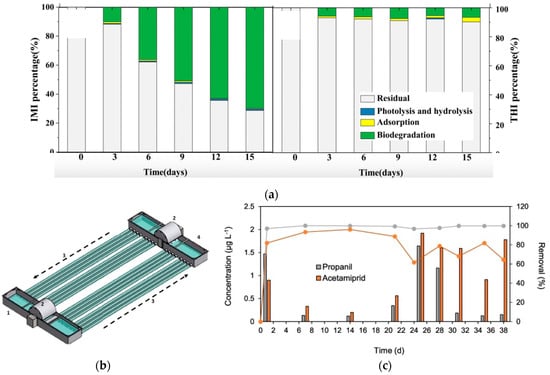 (a) The mechanisms involved in the removal of imidacloprid and thiacloprid [129]. (b) Schematic diagram of pilot scale semi-closed PBR used for the treatment of agricultural run-off [131]. (c) Concentration and removal efficiency of acetamiprid and propanil in the pilot PBR effluent as a function of operation duration [132]. (Reprinted with permission.)