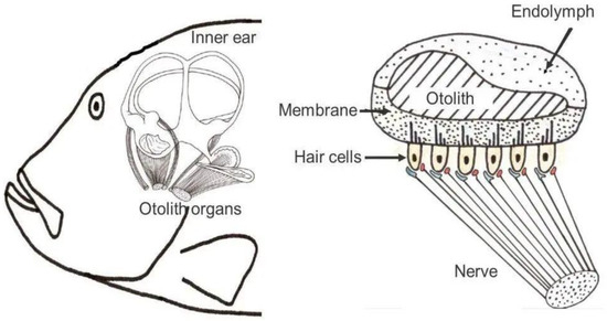 Sound is a mechanical disturbance that travels through a medium as a p-wave [27]. Sound energy is propagated outward in the form of sound pressure and particle motion. Fish auditory organs include the inner ear, swim bladder, lateral line, and air sacs, which help the fish to sense sound waves or overall vibrations in the water [28]. Sound signals are transmitted in an inertial-mediated pattern formed by the movement of acoustic particles, accompanied with the relative movement of dense otoliths and the sensory hair cell epithelium in the inner ear (Figure 1). The movement of sensory hair cells relative to otoliths (which are denser and lag behind as sound waves move) causes cilia to bend and ion channels to open, generating nerve impulses which are interpreted by the brain as sound [29,30], and thus complete the transmission of sound signals, which are eventually integrated into the central nervous system.