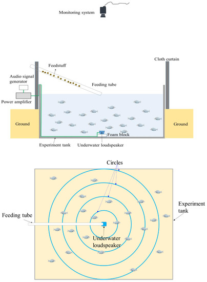In order to avoid the influence of sound caused by the feedstuff falling into the water on the sound used in the experiment, the nozzle of the tube was placed slightly below the water’s surface; a video recorder (LC5201B5) with a monitoring system (ImagineWorldClient) was installed directly above the tank to record the behavior of the fish during the experiment (Figure 3).