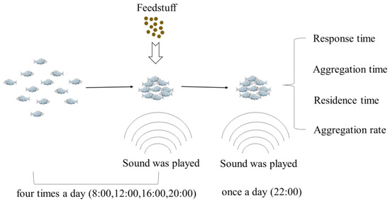 A test was carried out on the established conditioned fish with only one played sound, and the behaviors of the fish were observed with the monitoring system. The test was conducted three times a day, at 07:30, 12:00, and 17:00. The response time, aggregation time, residence time, and aggregation number of fish were recorded in each experiment. When there was no aggregation phenomenon and the behavior was the same as that of the control group at the moment sound was played, this suggested that the conditioned reflexes established by acoustic taming had been eliminated.
