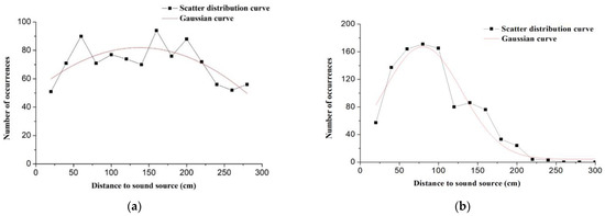 The Gaussian distribution model was used to analyze the positions of the fish in the tank when the sound was played. The efficiency index (I) was the ratio of the occurrence rate of fish in the aggregation area to its occurrence area [51]. The response time and aggregation time of fish in the control tank were calculated starting two minutes after the beginning of the test, and the residence time and aggregation rate of the fish in the aggregation area were the same as those in the test tank. We used the raw measured variables from the experiments when applying the Gaussian distribution model. We used the software Orign 8 for the data analysis.