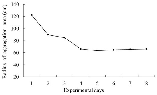 Changes in the radius of the aggregation area of the juvenile Pagrus major trained with 400 Hz square-wave continuous tones from the 1st day to the 8th day.