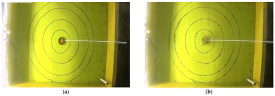 Before the test, the fish in the tank swam slowly and exhibited no clustering phenomenon. On the 1st day of acoustic conditioning taming, during the test at 22:00, the fish showed a behavioral response of panicking at the moment of the sound being played, with swimming speeds increasing sharply and fleeing away from the sound source. After 0.35–1.00 s, the fish gradually swam closer to the sound source, and swam in a whirling group which represented the seeking of feedstuff in the aggregation area. The duration of the panicking behavior was 0.75 s. On the 2nd day, the time of panicking and dissociation behaviors of the fish was less than 0.20 s. From the 3rd day to the 8th day, the fish demonstrated no panicking behavior and swimming away from the sound source at the moment of the sound being played; in contrast, the fish quickly gathered to the aggregation area and swam in a whirling group, in a state of seeking out the feedstuff. Within 120 s of the sound being played without the administration of feedstuff, the fish reacted strongly and their swimming speeds significantly increased. The fish gathered in the aggregation area within a very short space of time, swimming to the surface in regular circles under the tube (Figure 8). Occasionally, some of the fish jumped out of the water, expecting to catch the feedstuff. When that sound had finished playing, the gathered groups gradually dispersed and swam irregularly around the tank, but their swimming speeds were still higher than those before the sound was played. It took approximately five minutes for the fish behavior to return to that before the sound was played.