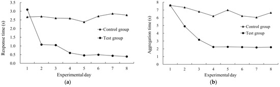 In the control group, the aggregation time varied around 6.73 ± 0.80 s within 8 days of acoustic conditioning taming. The aggregation time of the test group showed a trend of shortening with the increase in experimental days, and the aggregation time from the 4th day did not change substantially. The average aggregation time of the test group was 3.35 s (Figure 9).