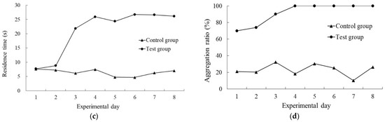 The residence time of the fish in the control group varied around 6.39 ± 1.70 s during the experiment. The residence times in the test group showed increasing trends with the increase in the experimental days and reached the peak on the 4th day; there was no major change thereafter. The average residence time of the test group was 21.15 s (Figure 9).