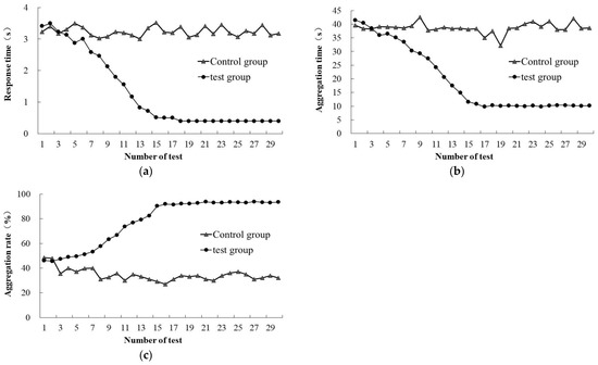 The response time and aggregation time of the fish in the test group decreased with the increase in number of experiments, and reached the lowest at the 18th and 17th experiments, respectively, and then maintained the same state (Figure 11). The response time in the 1st test was 3.41 s, and that in the 30th test was 0.40 s, with an average of 1.31 s. The response times of fish in the control group showed little change, in the range of 3.0–3.6 s, with an average reaction time of 3.24 s. The aggregation times in the 1st and 30th tests of the test group were 41.50 s and 10.17 s, respectively, with an average aggregation time of 19.69 s. The aggregation time of fish in the control group exhibited little change, with an average reaction time of 38.54 s. The aggregation rate of fish in the test group increased with the increase in the number of tests, with the best effect at the 21st test, and then fluctuated at that level (Figure 12). The aggregation rates of the group in the 1st and 30th tests were 46.20% and 93.60%, respectively, with an average aggregation rate of 77.63%. The average aggregation rate of fish in the control group was 49.38%.