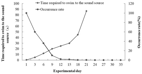After releasing the conditioned fish, over time, the time taken to swim to the sound source showed an increasing trend, and the occurrence rate showed a gradually decreasing trend (Figure 13). On the 15th day after release, eight fish clustered to the sound source, accounting for 1.6% of the total. On the 18th and 21st days, only one fish swam to the sound source after the sound was played, accounting for 0.2% of the total. In terms of the time required to swim to the sound source, on the 1st day of release it took 0.5 s; on the 21st day, the time taken was 87 s. After the 24th day, there were no fish gathering in the area near the sound source.