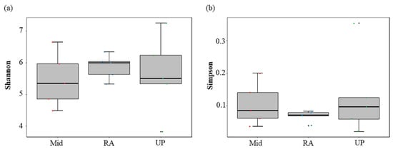Comparison of α diversity in different sections: (a) Shannon Index; (b) Simpson Index.