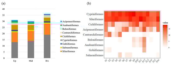 (a) Fish species composition in different segments; (b) Heat map of fish composition based on relative sequence abundance at each sample site.