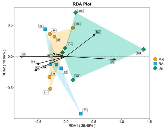In the RDA and variance inflation factor analyses, a total of seven environmental factors (Tem, TDS, Sal, pH, DO, NH4+, and Tra) were imported, and one environmental factor, TDS, was excluded. The total explanation of β diversity by the remaining six environmental factors was 49.39% (Figure 4). The sample points of the groups were interconnected to form a two-dimensional graph. The graphs formed by the three subgroups had no intersection between the Up and the RA, while the Mid and both the Up and the RA had intersections. On the RDA1 axis, Tem and DO were positively correlated, and the rest of the environmental factors were negatively correlated; on the RDA2 axis, Tem and NH4+ were positively correlated. The R2 for the environmental factors in the RDA analysis were DO, pH, Tem, Tra, Sal, and NH4+, in descending order. The p-value for DO = 0.001, the p-value for pH = 0.028, and the p-values for the rest of the environmental factors were greater than 0.05.