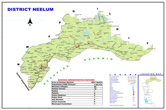 The district of Neelam (DNLM) is situated in the Himalayan gorge, also known as Neelam valley, which is located north to south of Muzaffarabad, the capital of Azad Jammu and Kashmir (AJK), Pakistan. Neelam valley expands on both sides of the Neelam River (NR) [34]. It is a long, arch-shaped valley home to several waterfalls, springs, gorgeous pine, cypress, and deodar trees (Figure 1). Rough mountains surround Neelam valley with an average height of 2554 m, and some peaks as high as 4570 m [35].