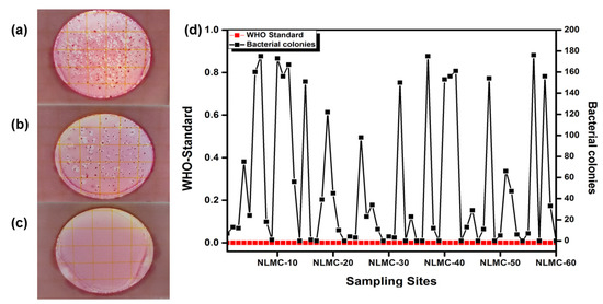 (a) shows the presence of total coliforms, (b) E. coli having different colony colors, (c) bacterial-free sample and (d) WHO standards for bacterial contamination and the number of colonies obtained at different sites of DNLM in the current experiments.