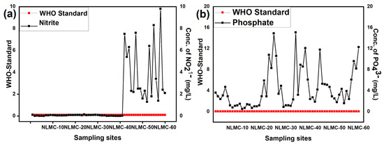 Shows the plot between the high concentrations of NO2−1 vs. the standard values by the WHO at different sampling sites of the district of Neelam, AJK (a,b) the concentration of PO43− against the WHO standard.