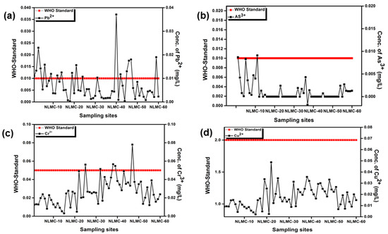 The plot between the concentration of heavy metals vs. the standard values by the WHO at different sampling sites of the district of Neelam, AJK. (a) Pb (b) As, (c) Cr3+, and (d) Cu2+ against the WHO standards.