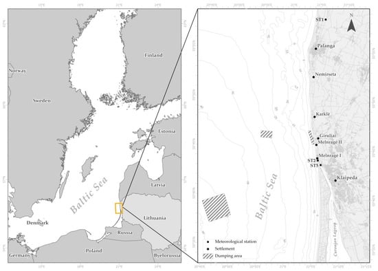 Overview of the study site. ST1—Palanga Aviation meteorological station, ST2—Klaipėda meteorological station, ST3—Port of Klaipėda station.