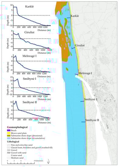 The northern part of the Lithuanian coast is the mainland coast, which extends north from the Port of Klaipėda jetties. This part of the Lithuanian coast is more geologically diverse than the southern part [,]. In the northern part of the mainland coast (Palanga–Būtingė), sandy sediments prevail, forming mainly in the Littorina and Post-Littorina seas [,]. The southern part of the mainland coast (Giruliai, Nemirseta, Melnragė) consists of the moraine (glacial deposits) and coarse sand (Figure 2 and Figure 3) [,].
