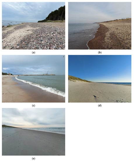 The unique relief of the Baltic Sea coast is and has always been formed by two main natural elements—the sea and the wind. Therefore, most coastal relief forms are related to their geological activity [,,]. Depending on the sea level, wave parameters, underwater currents, and several other natural and often anthropogenic factors are forming wider and/or narrower beaches [,]. The litho- and morpho-dynamics processes play an important role in the shore formation mechanism. On land, they are mainly determined by aeolian processes, while at sea and on the beach, by hydrodynamic processes [,,].