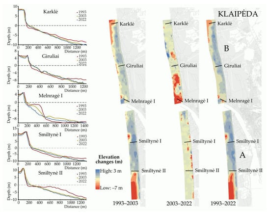 Elevation changes of the coastal zone on the Curonian Spit (A) and the mainland (B) coasts.