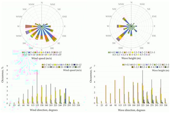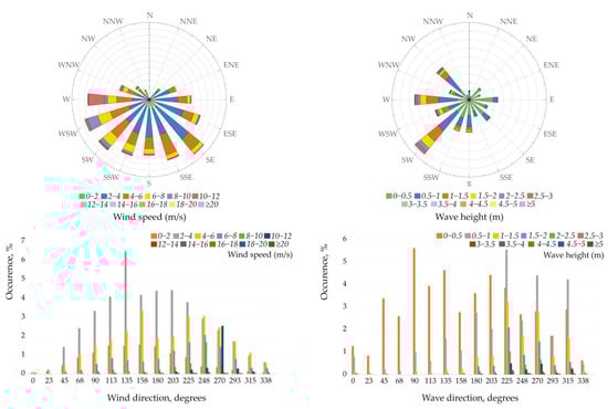 According to hydrometeorological data analysis, during 1993–2021, westerly, south-westerly, and southerly winds prevailed in a study area, while during 1993–2019, wave directions were west and southwest (Figure 5). Throughout the study period, the prevailing wind speeds of 2–4 m/s and 4–6 m/s was observed, while the mean wave height was between 0–0.5 m and 0.5–1 m.
