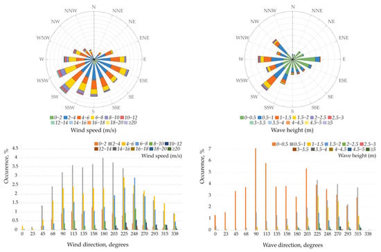 The wind rose diagram for wind direction and speed (m/s) from 2003 to 2021, a wave rose diagram for wave direction and mean wave height (m) from 2003 to 2019, the frequency distribution of wind speed (m/s) from 2003 to 2021, and frequency distribution of wave height (m) from 2003 to 2019.