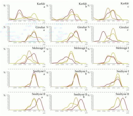 Grain size composition of surface sediments at profiles from Karklė, where a—dynamic shoreline, b—mid-beach, and c—foredune; Giruliai, where a—dynamic shoreline, b—mid-beach, and c—foredune; Melnragė I, where a—dynamic shoreline, b—mid-beach, and c—foredune; Smiltynė I, where a—dynamic shoreline, b—mid-beach, and c—foredune; Smiltynė II, where a—dynamic shoreline, b—mid-beach, and c—foredune, throughout 2003 (red line), 2012 (orange line), and 2022 (yellow line) years.