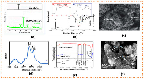 (a) XRD patterns for graphite and rGO/ZnFe2O4 “Reprinted/adapted with permission from Ref. [30]. 2016, Elsevier”. (b) XPS analysis of rGO/CoFe2O4 “Reprinted/adapted with permission from Ref. [31]. 2017, RSC” (c) FESEM images of CoFe2O4/graphene composite showing firm adhesion between pristine SF and graphene “Reprinted/adapted with permission from Ref. [32]. 2021, RSC”. (d) Raman spectra of ZnFe2O4/rGO “Reprinted/adapted with permission from Ref. [33]. 2014, Elsevier”. (e) FTIR data for MnFe2O4, GO/MnFe2O4 composite, and GO “Reprinted/adapted with permission from Ref. [34]. 2014, ACS”. (f) TEM image for rGO/CoFe2O4 “Reprinted/adapted with permission from Ref. [36]. 2015, ACS”.