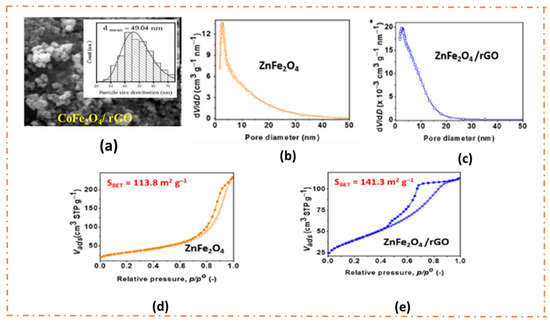 (a) FESEM image of CoFe2O4/rGO composite “Reprinted/adapted with permission from Ref. [40]. 2020, Elsevier”. BJH adsorption pore size distribution curve for (b) ZnFe2O4 and (c) ZnFe2O4/rGO; N2 adsorption–desorption isotherm for (d) ZnFe2O4 and (e) ZnFe2O4/rGO (“Reprinted/adapted with permission from Ref. [41]. 2020, Elsevier”.