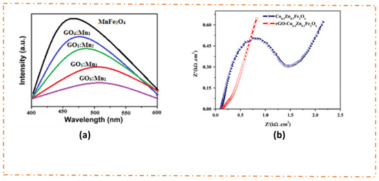 (a) PL spectra of MnFe2O4 and MnFe2O4/graphene composites (GO4:Mn1, GO2:Mn2, GO1:Mn1, and GO5:Mn1) “Reprinted/adapted with permission from Ref. [45]. 2016, Elsevier”. (b) EIS spectra for CoxZn1−xFe2O4 and CoxZn1−xFe2O4/rGO “Reprinted/adapted with permission from Ref. [46]. 2016, Elsevier”.