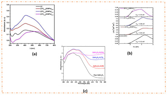 (a) UV–visible absorbance spectra and (b) Tauc plots for pristine CaFe2O4 and CaFe2O4/graphene composite with different amounts of graphene “Reprinted/adapted with permission from Ref. [51]. 2021, Elsevier”. (c) UV–visible diffusive reflectance spectra of ZnFe2O4/rGO composite “Reprinted/adapted with permission from Ref. [52], 2020, Elsevier”.