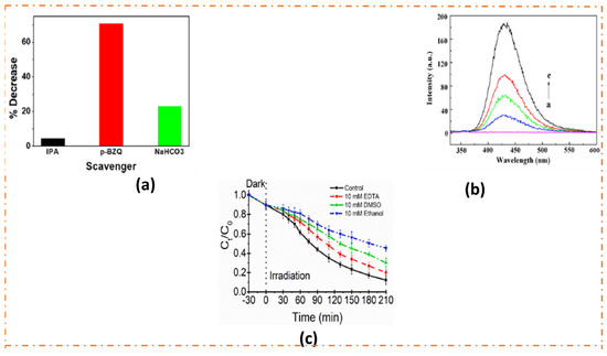 Spinel ferrites such as CoFe2O4, MnFe2O4, etc., experience a moderate redox ability, as their VB and CB positions are placed above the potential required for water oxidation and below the potential needed for O2 reduction, respectively. Since the direct production of ·OH and O2− from WOR and ORR, respectively, is thermodynamically unreasonable, the dye-degradation pathway proceeds through the photo-Fenton mechanism that was depicted in Section 4.1 and presented in Equations (8)–(13). Wei and co-authors demonstrated that MnFe2O4/rGO nanocomposites degraded MB efficiently through the photo-Fenton process [65]. In another set of experiments, ·OH radicals were found as the primary reactive species in the photodecolorization of MO and MB over CoFe2O4/rGO composites, and these were generated through the photo-Fenton mechanism [66]. Mazarji et al. conducted scavenging experiments in order to confirm the major reactive species that takes part in the degradation of BR46 over rGO-CoFe2O4 by the photo-Fenton process. They used ethanol, DMSO, and EDTA as scavenging agents for OH., O2−, and h+, respectively. Figure 5c shows that the dye-degradation reaction was significantly suppressed in the presence of ethanol, suggesting that .OH played the principal role in the pollutant degradation [67].