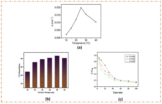 The degradation of organic dye over a photocatalyst is largely influenced by temperature. The collision probability between the dye and the photocatalyst increases with an increase in temperature. This leads to an enhanced photodegradation efficiency, and maximum dye decomposition is observed at a particular temperature [82]. A further increase in temperature causes the desorption of dye molecules from the photocatalyst surface. As a result, the photodegradation rate is substantially decreased. Liang and co-workers studied the effect of temperature on photocatalytic MB degradation over a NiFe2O4/rGO composite. The degradation rate constant (k) started increasing with an increase in temperature up to 25 °C. However, the rate constant value was significantly decreased by raising the temperature further (Figure 6a) [53]. Therefore, 25 °C is considered as the optimum temperature for maximum photodetoxification.