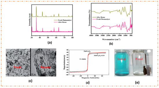 The stability of a photocatalytic system under operating conditions is a vital aspect for its practical applications. Photocatalysts with substantial chemical and physical stability can be recovered and reused frequently. This increases their cost-effectiveness and makes them decorous for large-scale production [20]. The presence of graphene in MFGNs acts as a support material, and spinel ferrite nanoparticles are decorated over graphene surface through strong chemical bonds. This anchorage enables MFGNs to be used frequently without any noticeable loss in physicochemical properties. The magnetically recoverable rGO/ZnFe2O4 nanocomposite showed no significant decrease in its photocatalytic activity regarding MB detoxification for up to nine consecutive cycles, and the degradation rate was maintained above 90% for each cycle [88]. Rahman and co-workers reported that a Ce-doped Nickel ferrite/rGO composite retained its crystal structure even after five consecutive cycles. They observed no such significant change in the XRD pattern of the sample after being used for five runs (Figure 7a). Any changes in the chemical bonding and structure after reuse can easily be evident from FTIR studies. Figure 7b shows the FTIR data for a Ce-doped NiFe2O4/rGO composite before and after use. It was observed from the spectra that the vibrational modes are quite similar for both the samples, except for some disturbances in the peaks around 1250 and 1000 cm−1 for the fresh sample. The deviation might be due to the presence of MB. This suggests that the MB was completely mineralized over the photocatalyst under visible-light irradiation [64]. Yin et al. studied the microstructural changes in a CoFe2O4/rGO nanocomposite after six consecutive cycles. They compared the TEM image of the prepared nanocomposite with that obtained after six cycles of dye degradation (Figure 7c). The two images showed no remarkable changes, revealing that the composite photocatalyst retained its morphology even after six cycles of use, and the ferrite nanoparticles were arranged uniformly as before on the exfoliated graphene sheets [31]. These reported pieces of evidence prove the extraordinary stability exhibited by MFGN nanocomposites for the photodetoxification of organic dyes.