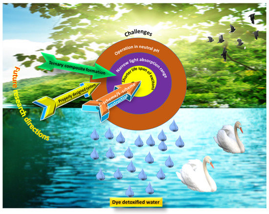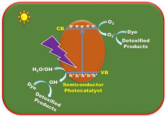 Water is the most vital and essential component for the survival of living organisms. The use of safe and clean water leads to a healthier life. However, massive establishments in industries such as paper, pigments, textiles, apparel, etc., discharge substantial amount of dye-containing effluents into natural aqueous ecosystems [1,2]. It has been reported that 10–12% of dyes are used in textile industries every year, out of which 20% are released in the form of waste water into nearby water bodies. According to a World Bank report, 17–20% of water pollution is caused by the effluents from the dyeing and textile industries. The Ecological and Toxicological Association of the Dyestuffs Manufacturing Industry (ETAD) reported that 90% of the tested 4000 dyes exhibited a medial lethal dose (LD50) of greater than 2 × 103 mg kg−1. Being strongly non-biodegradable, these organic molecules freely enter into the human body and pose serious ailments owing to their acute toxicity [3]. Therefore, it has been a challenge for the scientific community to eradicate these noxious substances from aquatic environments. Various techniques including adsorption, membrane separation, ion exchange, coagulation, etc., have been employed to remove these dyes from water and waste water [4,5,6]. Although the adsorption process has been widely adopted for the removal of dyes due to its cost effectiveness and ease of operation, its practical application is greatly restricted by several bottlenecks such as a prolonged desorption period, the generation of secondary pollutants, and the incomplete removal of dyes [7]. In contrast, the photocatalytic degradation of dyes over a semiconductor’s surface under visible light irradiation has been garnering excitement in recent years, as it completely decomposes dye molecules into harmless products such as H2O and CO2 [8,9].