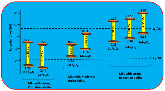 The photoexcited and well-separated e−s carry out reduction reactions with surface-adsorbed oxygen molecules to generate highly reactive superoxide (O2−) anions, as shown in Equation (3), only when the conduction band edge level of the MF lies above the potential of the O2/O2− redox couple (). Similarly, strongly reactive ·OH radicals are produced through the water-oxidation reaction by the holes of the MFs with VB positions that are more positive than the redox potential of the H2O/·OH couple () or that of the OH−/·OH couple (), according to Equations (4) and (5) [55,56]: