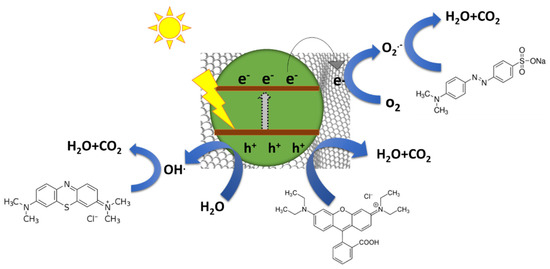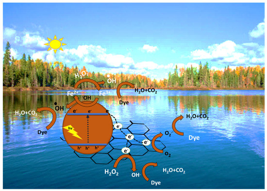 dye detoxification, per Equation (7). However, the possibility of the formation of ·OH radicals through the holes-driven water-oxidation reaction is overruled due to the inadequate VB levels of these MFs. However, the production of ·OH radicals was ascertained with the help of the photo-Fenton reaction mechanism. According to this, the photogenerated electrons on the graphene sheets reduce H2O2 into ·OH and OH−, per Equation (8) [57].