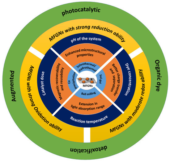 Reaction parameters such as solution pH, catalyst dose, dye concentration, and temperature significantly influence the dye-degradation performance of the photocatalysts [79]. Studies optimized these parameters for the maximum efficiency of MFGNs for the photodetoxification of dyes.