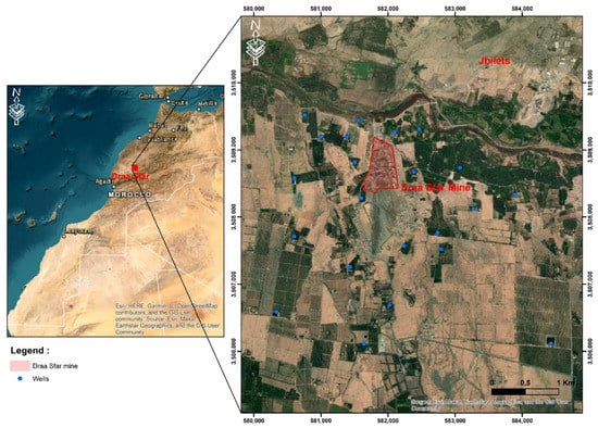 - Boujghad, A.; Bouabdli, A.; Baghdad, B. Groundwater Quality Evaluation in the Vicinity of the Draa Sfar Mine in Marrakesh, Morocco. Euro-Mediterr. J. Environ. Integr. 2019, 4, 12. [Google Scholar] [CrossRef]