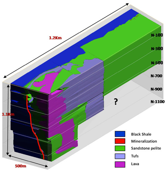 - Salama, L.; Mouguina, E.M.; Nahid, A.; Bachari, E.E.; Outhounjite, M.; Maacha, L.; Zouhair, M.; Naciri, A.E. Apport de la modélisation géologique 3D à l’exploration minière: Etude de cas du gisement de Draa Sfar (Jbilets centrales, Maroc). Int. J. Innov. Sci. Res. 2016, 22, 72–89. [Google Scholar]