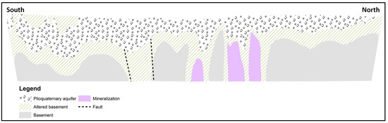 Saline groundwater near sulfide deposits has been identified in a Zn mine in the Atacama Desert in Chile [18] and in Zn and Pb mines in Canada (Restigouche, Bathurst Mining Camp and Northern New Brunswick) [19]. In the case of the Canadian mines, the dominant ions are still sodium and chloride, but nevertheless, the Restigouche brines are relatively less mineralized (with a TDS of 21 g/L) than those of Bathurst Mining Camp and Northern New Brunswick (TDS between 22 g/L and 45g/L). In the Canadian deposits, water mineralization was associated with water–rock interactions. In the case of the Atacama mine, however, mixing with deeper, more saline water could explain the high water concentrations and examine the possible contribution of the deep salinity source that will have been determined in the mine to the high salinities found in the shallow Plio-Quaternary aquifer observed near the mine.