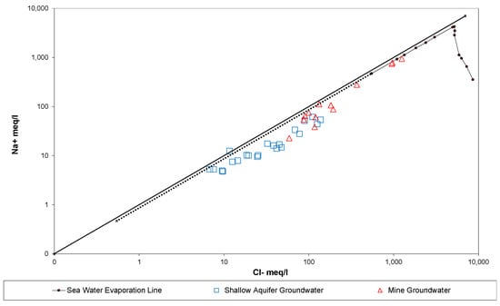 The concentration of Na+ and Cl− (Figure 4) shows that the groundwater from the shallow aquifer is below the halite dissolution and seawater dilution lines, indicating an excess of Cl− compared to Na+. Regarding the mine groundwater, the high salinity samples project onto the seawater evaporation line, while the less saline samples show a similar signature to the saline shallow aquifer groundwater. Figure 5 shows that the Na+/Cl− ratio of groundwater in shallow aquifers decreases slightly with increasing chloride concentration and remains quite low, while the Na+/Cl− ratio of mine groundwater increases with increasing chloride concentration.