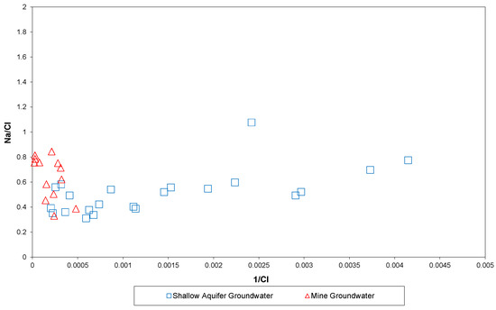 Plot of Na+/Cl− (meq/meq) versus 1/Cl− of shallow aquifer and mine groundwater.