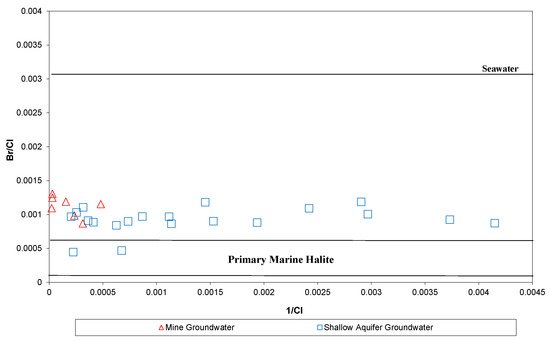 Plot of Br−/Cl− (meq/meq) versus 1/Cl− of shallow aquifer and mine groundwater.